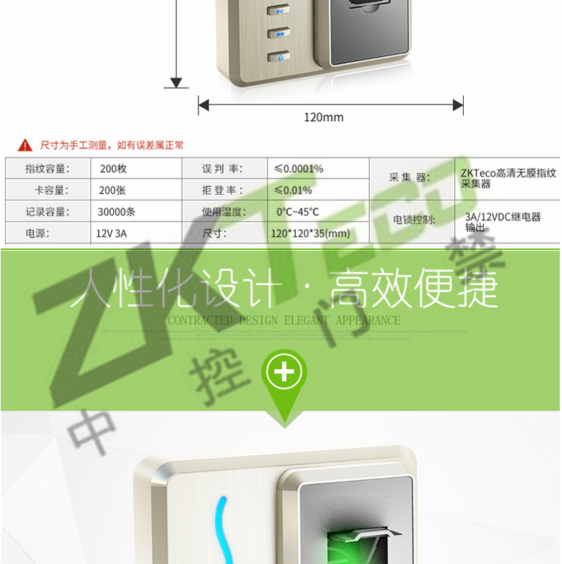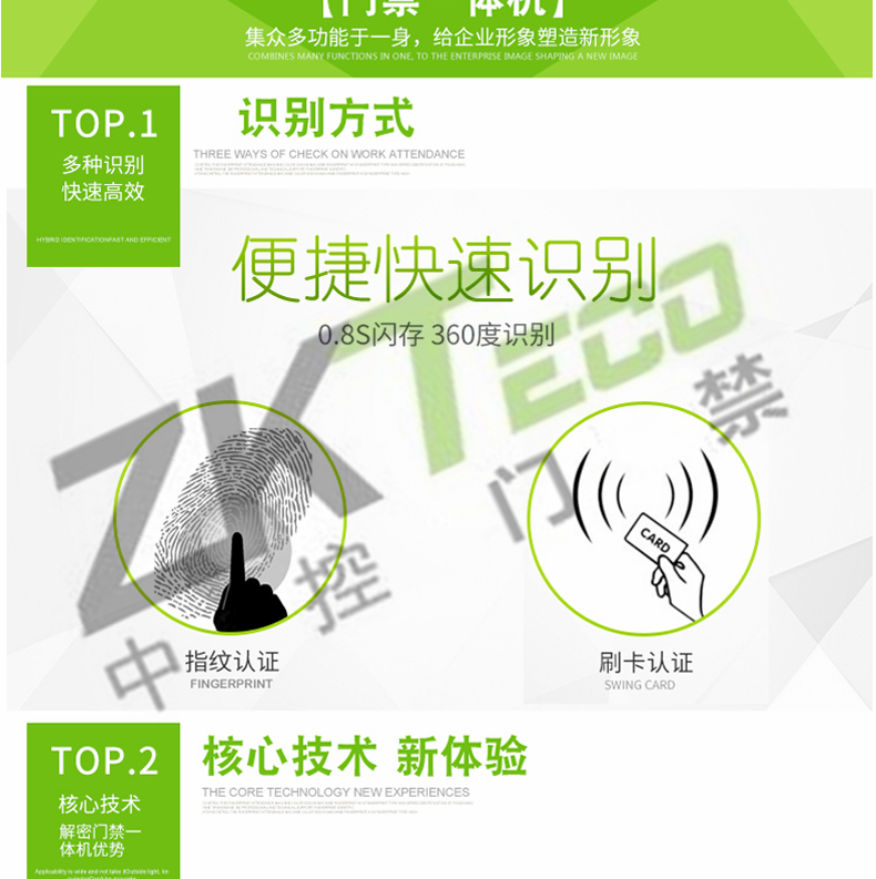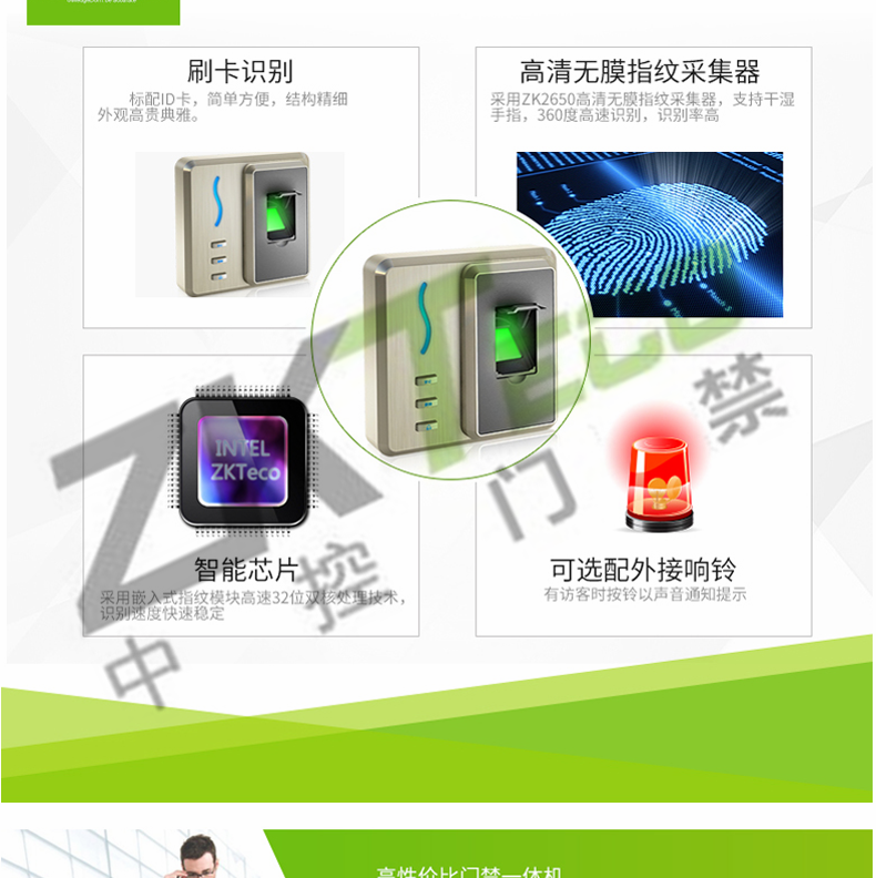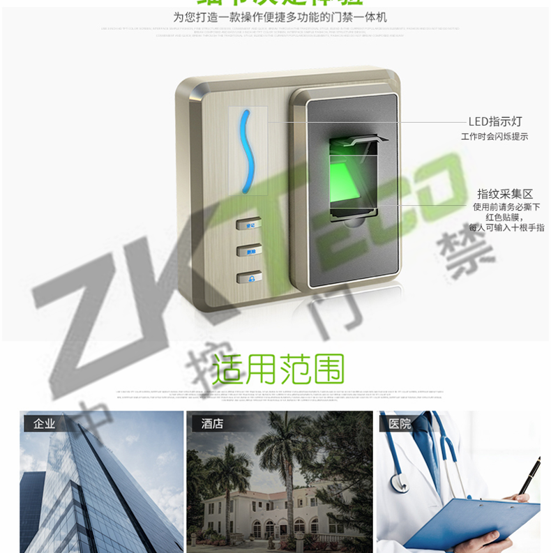 產(chǎn)品介紹:本產(chǎn)品是一種可直接控鎖,又可以連接控制器使用的指紋門禁一體機,該產(chǎn)品采用堅不可摧的鋅合金材料,表面采用珍珠烙處理工藝,高貴典雅的歐美設(shè)計風格。該產(chǎn)品采用大量可靠穩(wěn)定的進口元器件,設(shè)計上嚴格遵循國家安全防范產(chǎn)品標準,出廠經(jīng)過嚴格的老化測試。該產(chǎn)品只有登記、刪除和門鈴三個按鍵,操作的每一步都有語音提示,使得客戶操作更加簡單方便,無LCD設(shè)計和指紋儀防塵翻蓋起到了很好的防塵作用,保證整個產(chǎn)品清潔,USB-Client通訊方式大大減少了布線的繁瑣,標配ID卡模塊,為客戶使用提供更大的選擇空間,適合于小型辦公環(huán)境、企業(yè)內(nèi)部和一些安全級別要求較低的出入場所。