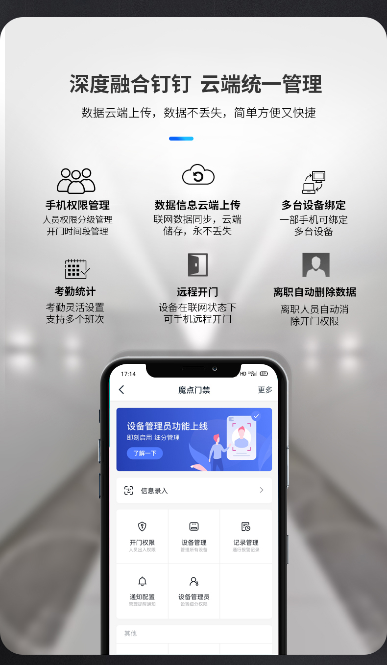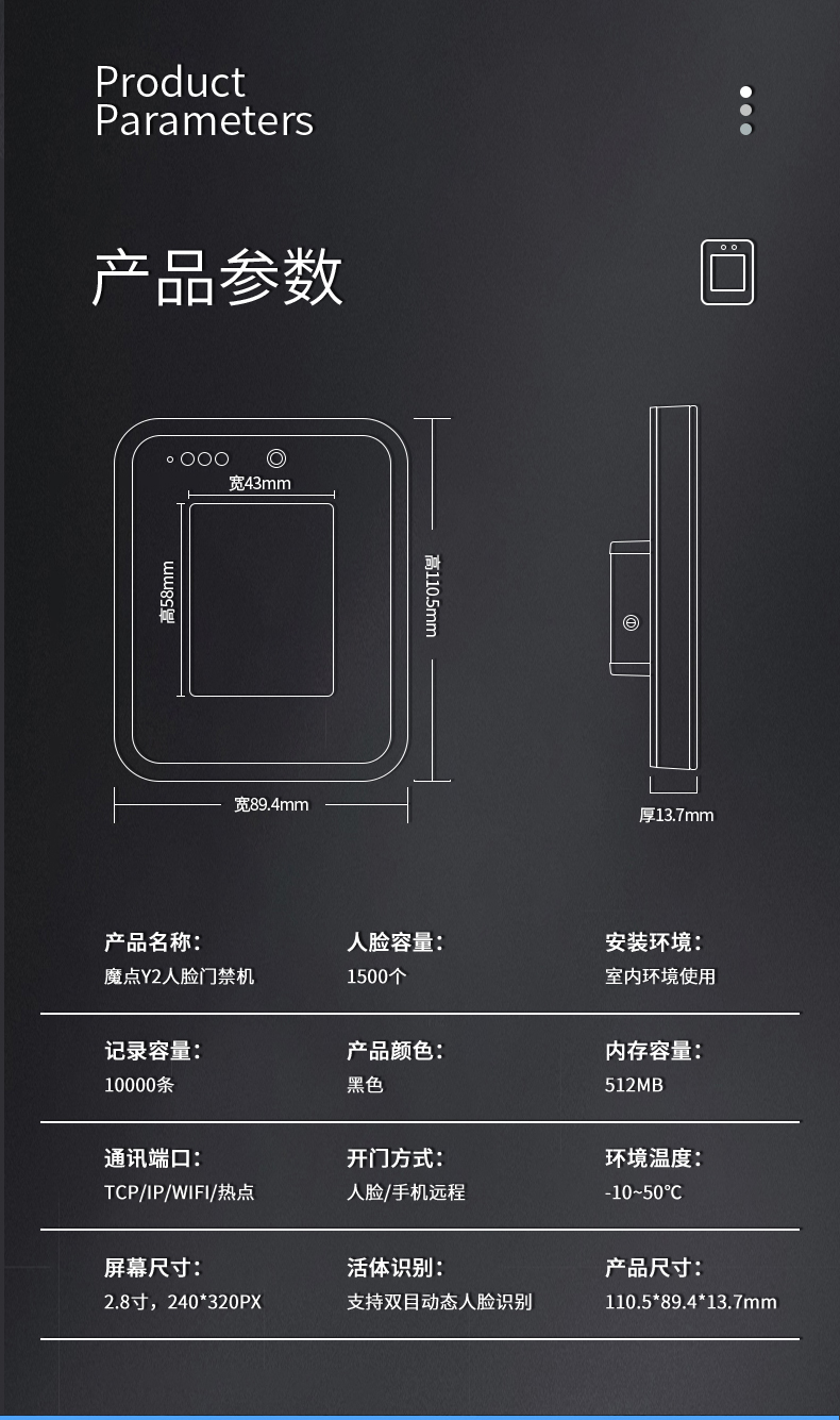 魔點(diǎn)Y2智能人臉考勤門禁搭載海思處理器和智能雙攝,配2.8寸觸摸屏,識(shí)別速度僅0.3秒,離線支持1500張人臉容量。 雙目合璧 活體防偽 采用混合光譜技術(shù),活體防偽,抵御圖像攻擊 突破地域限制 跨區(qū)域考勤數(shù)據(jù)云端實(shí)時(shí)同步 考勤數(shù)據(jù)一鍵生成,手機(jī)可查,輕松便捷 出差,遲到、缺卡,各種出勤狀況清晰匯總 擺脫空間束縛 支持多場(chǎng)景安裝 玲瓏身材,支持玻璃、大理石、乳膠漆等多種墻面安裝,適配更多樣,使用更便捷