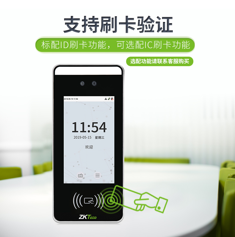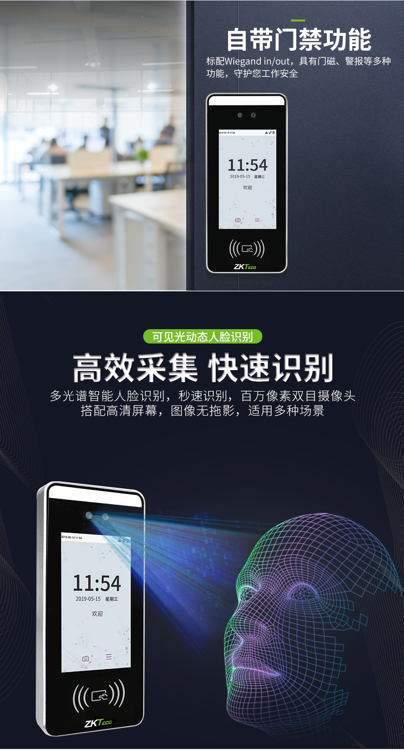中控xface60非接觸式刷卡門禁是中控智慧根據市場需求,全新推出的多光譜智能考勤機,區別于以往的人臉靜態識別,具有快速讀取、動態識別的功能。xFace60采用Linux操作系統,具有刷卡認證、人臉識別等驗證方式,簽到多種選擇,輕松考勤;中英文輸入法,輕松編寫。標配Wiegand in/out,具有門磁、報警等多種功能,守護您工作安全。