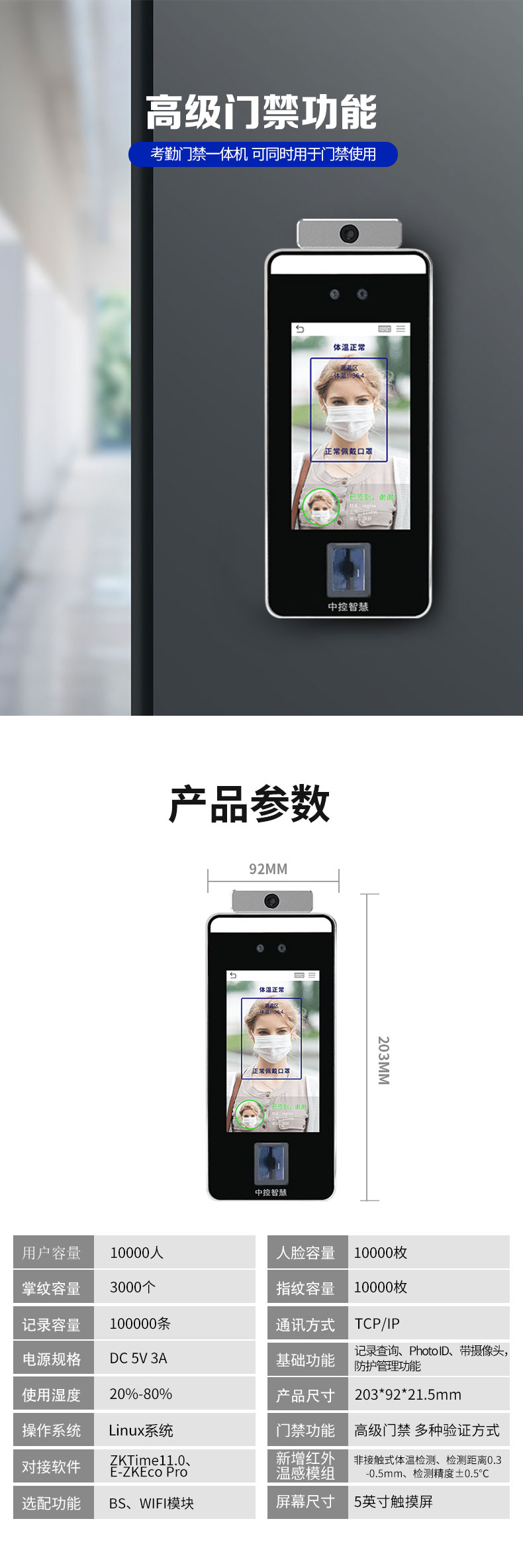 非接觸式掌紋門(mén)禁xface600plus 測(cè)溫門(mén)禁智能終端