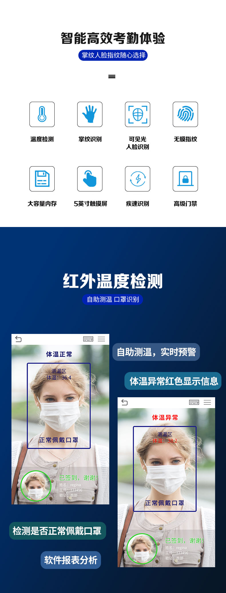 非接觸式掌紋門(mén)禁xface600plus系列基于熵基科技深度學(xué)習(xí)算法,通過(guò)對(duì)人的掌紋或臉部、指紋特征信息實(shí)現(xiàn)快速身份識(shí)別,讓人們享受到更加安全、便捷、高效的通行體驗(yàn),推出的非接觸式混合生物識(shí)別終端。xFace600-Plus還搭載高性能紅外體溫檢測(cè)模塊,人員通行時(shí)即時(shí)檢測(cè)人表體溫并報(bào)警,提供更為安全、便捷、高效的通行體驗(yàn)。另外,xFace600-Plus廣泛適用于社區(qū)、校園、醫(yī)院、景區(qū)、酒店、商場(chǎng)、寫(xiě)字樓、公共服務(wù)場(chǎng)所等場(chǎng)景。